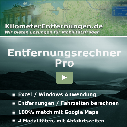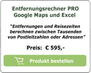 Suchen Sie eine effiziente Methode, um die Kilometerentfernung und Reisezeit zwischen mehreren Postleitzahlen zu berechnen? Der Entfernungsrechner Pro berechnet innerhalb weniger Minuten den Entfernung zwischen tausenden Adressen oder Postleitzahlen.